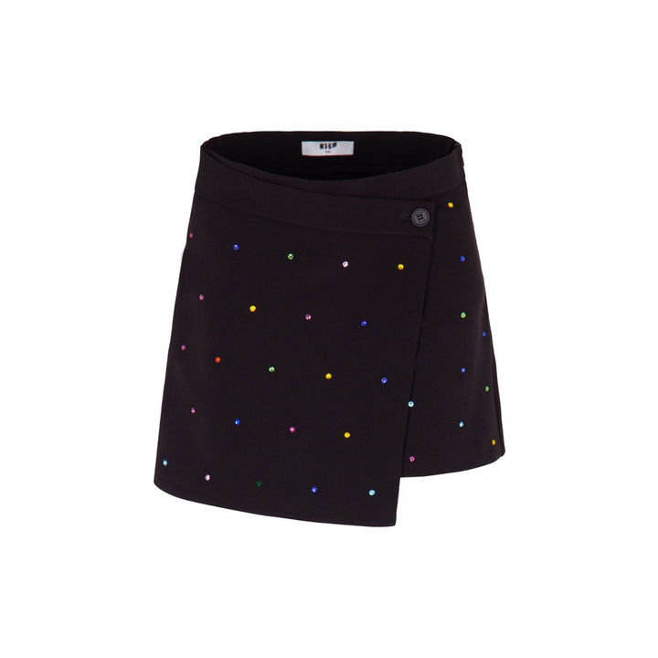 Both smart and fun, a lightweight black skort for girls by Italian brand MSGM. It has colourful crystal embellishments on the front and a logo button fastening. Fully lined in voile for comfort, it has an adjustable waistband for a good fit and a discreet, concealed side zip with a silver logo pull tab.