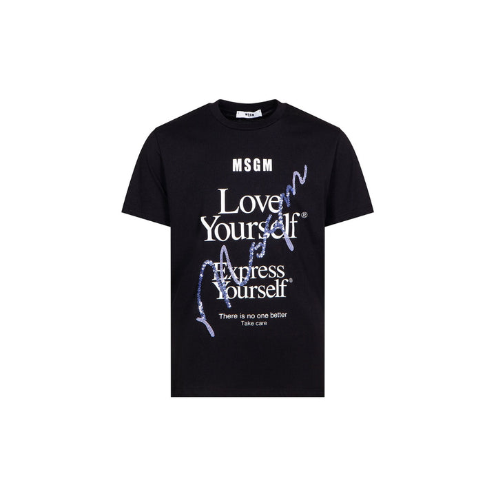 Black cotton T-shirt for girls by Italian brand MSGM. This soft and stretchy jersey top is printed with an MSGM Love Yourself logo graphic in white, with a lilac sequinned and beaded script logo above for a textured finish.
