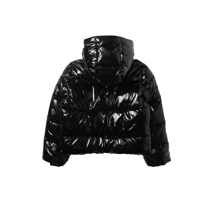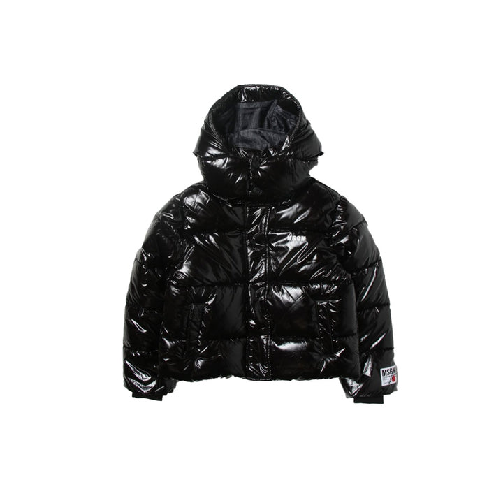 Stylish fuchsia Black puffer jacket for girls by Italian brand MSGM. Eye-catching with a glossy finish, it has a small black logo print on the chest and a contrasting white and black rose logo patch on one of the cuffs. It has a silky black lining with an all-over grey logo print which shows on the removable, zip-on hood. To keep the cold chills out, it has adjustable toggle drawstrings on the hem and fastens with a chunky black zip underneath a popper fastening flap.
