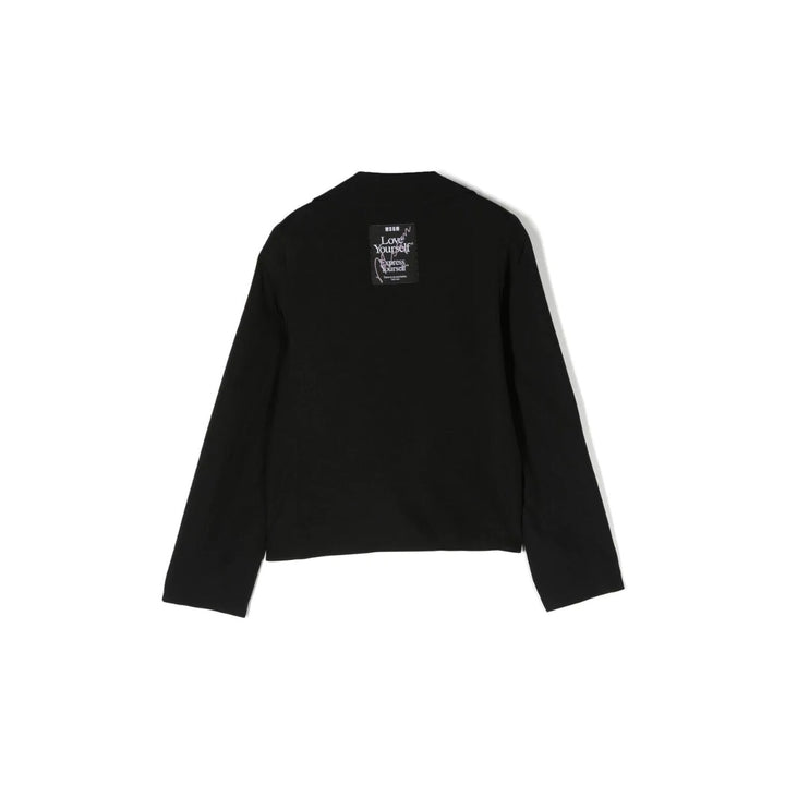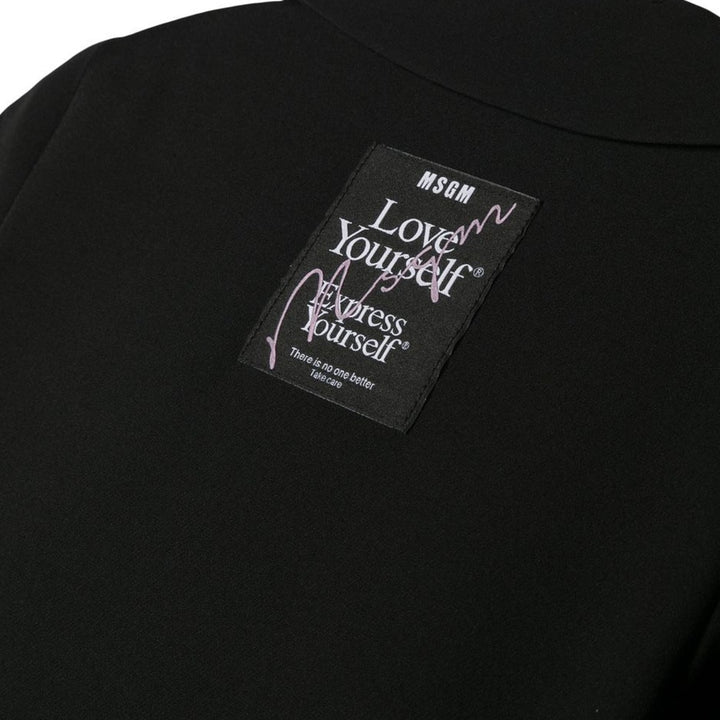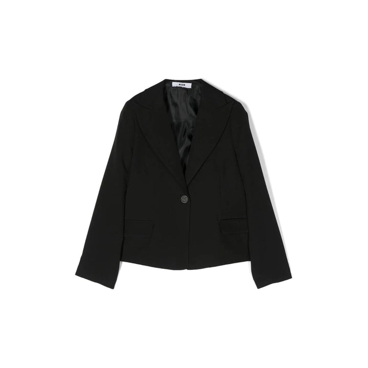 Girls single-breasted blazer from MSGM Kids featuring black, logo patch to the rear, peak lapels, front button fastening, long sleeves, two front flap pockets and full lining.