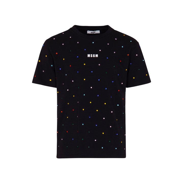 Black T-shirt for girls by MSGM, sparkling with colourful diamantés for an eye-catching look. Made in soft and comfortable cotton jersey, this stylish crew neck tee has a white micro logo print on the front for a signature designer finish.