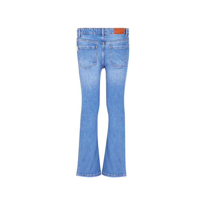 Washed blue flared jeans for girls by Italian brand MSGM, with a bold white brushed logo print on one leg. Made in soft cotton denim with a slight stretch for comfort, they have five-pocket styling and an adjustable waist for a great fit. Completing the designer look, they have an embroidered logo on the hip, a branded jacron on the back, and fasten with a zip and branded button.