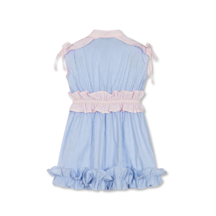 From Italian brand MSGM, a blue and white striped shirt dress for girls with pretty pink trim. Made in a soft and lightweight cotton blend, this sleeveless style has a pointed collar, branded button fastenings and adjustable drawstrings on the shoulders. The elasticated waistband adds comfortable shaping with a pretty ruffle detail that contrasts beautifully with the ruffled hem. Completing the look with a signature touch, there is a white embroidered micro logo on the chest.
