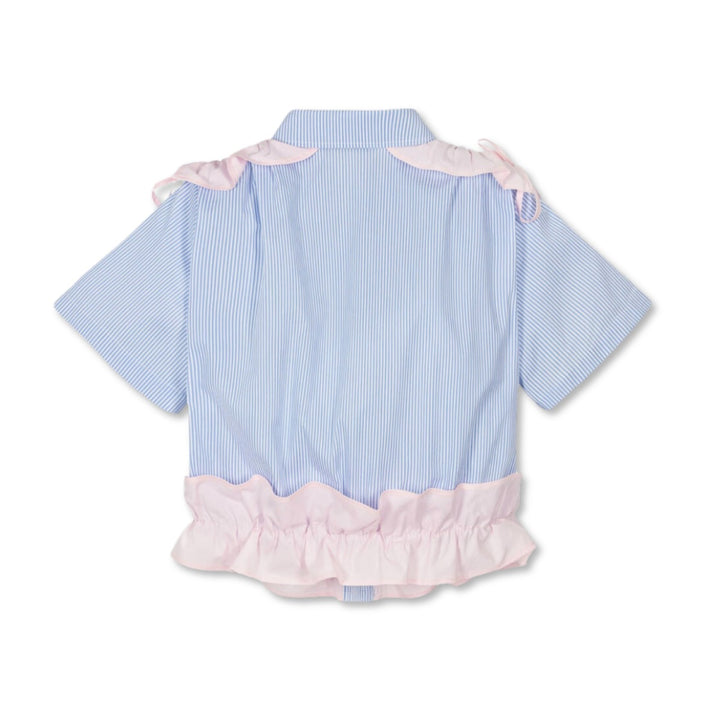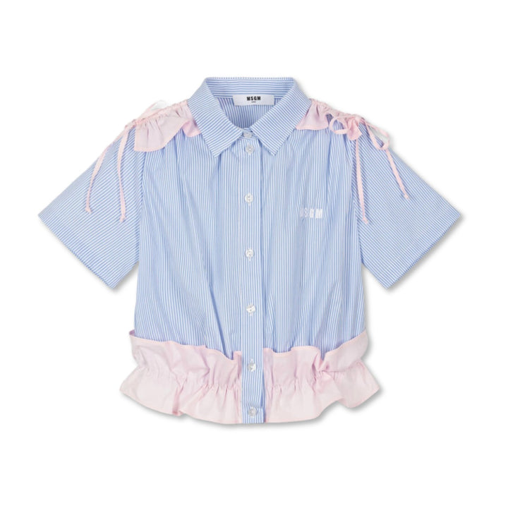 Blue and white striped shirt for girls by MSGM, with a white micro logo embroidered on the chest. Stylish and feminine, there are pretty pale pink frills on the elasticated hem, and drawstring details on the shoulders that can be tied into pretty bows. Fastening with branded buttons on the front, this short-sleeved style has a pointed collar and is made from lightweight cotton poplin.