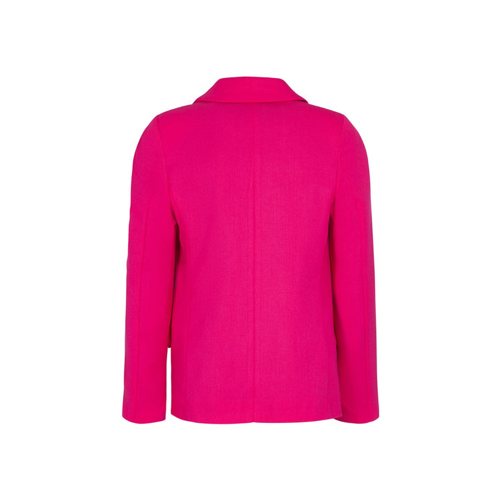 Smart fuchsia pink blazer for girls by Italian brand MSGM, with a tailors style, brushed logo badge on one sleeve. Made in soft twill, this tailored jacket is slightly fitted, with lightly padded shoulders and flap pockets on the front. It fastens with branded black buttons and has a lightweight, satin lining to ensure comfort as well as style.
