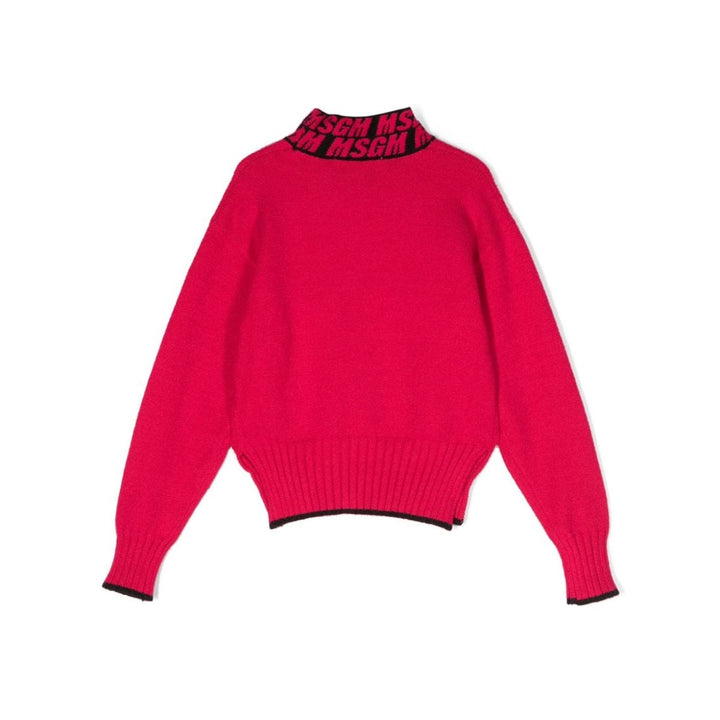 A fuchsia pink jumper for girls by MSGM, knitted in a soft ribbed viscose-blend. Warm and cosy, there are contrasting black logos around the neckline and matching stripe trims for a cool branded look.