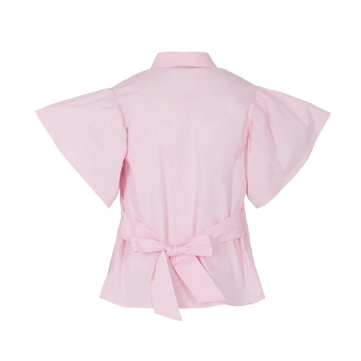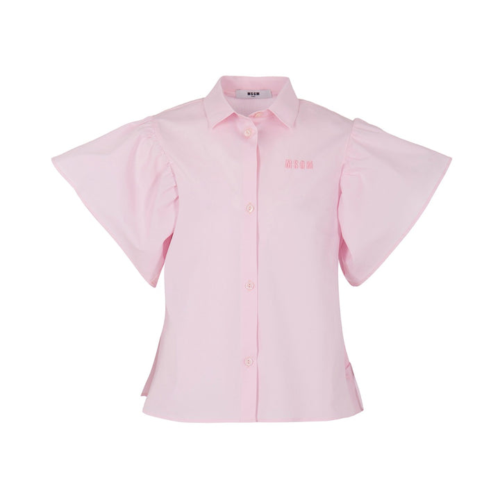 A pretty pale pink shirt for girls by MSGM, made in soft cotton poplin. Offering a fun and girly vibe, it has dramatic ruffled short sleeves and a bow tie detail at the back. The label's signature logo is subtly embroidered on the chest and branded buttons fasten down the front.