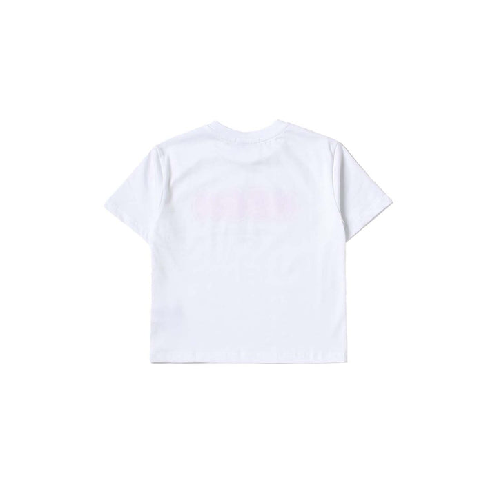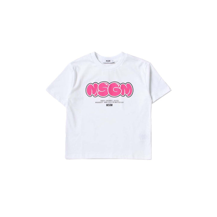 White t shirt jersey logo-print short-sleeved T-shirt from MSGM Kids featuring pink, logo print to the front, crew neck, short sleeves, straight hem and cotton.\
