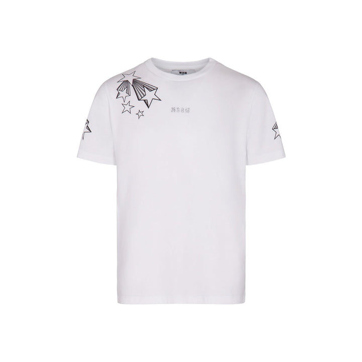 White t-shirt for girls Italian brand MSGM. Made from soft cotton jersey. It has silver logo on the chest and stars print on the front and sleeves.