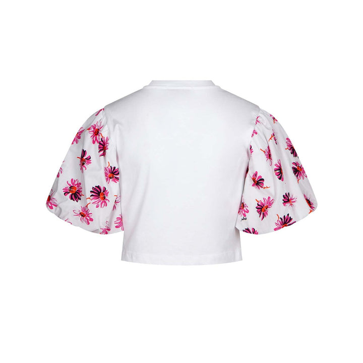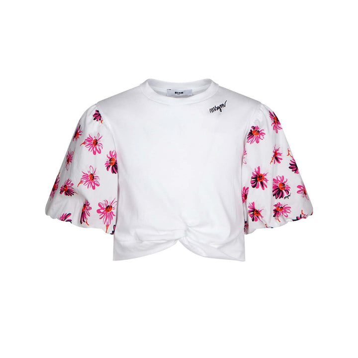 White cropped cotton top for girls by Italian designer MSGM, with dramatic puffed sleeves. The body is made in soft jersey, with an embroidered black logo on the chest for a signature look, and a feminine knotted detail at the front. The sleeves are made in smooth poplin and patterned in a pretty pink, black and orange flower print, with subtle logo detailing.\