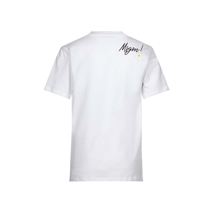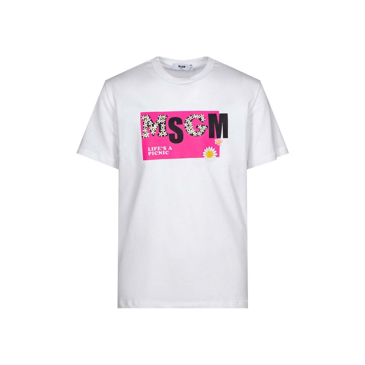 Designed by Italian label MSGM, a white cotton T-shirt for girls. This cool multi-textural design features a pink floral box logo print with yellow beaded lettering, crochet motifs and the slogan, 'Life's a Picnic' in white. Stitched on the back is a beaded fabric flower with the designer's black script logo. This comfortable top is made in soft and stretchy jersey.\