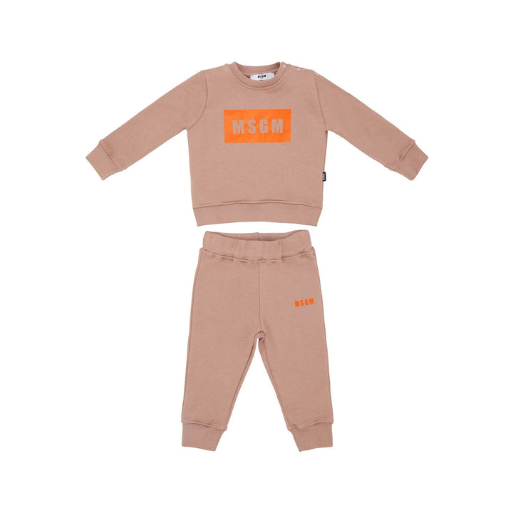 Beige tracksuit for younger boys and girls by MSGM, ideal for relaxed days. Warm and cosy, both pieces are made in soft mid-weight cotton jersey, with a fleecy inside. The crew neck sweatshirt has the brands iconic box logo printed on the front in vibrant orange, cosy ribbed trims and easy-fastening poppers on one shoulder. The joggers have a gently elasticated waist, a small pocket on the back, and a matching logo print on one leg for a complete designer look.