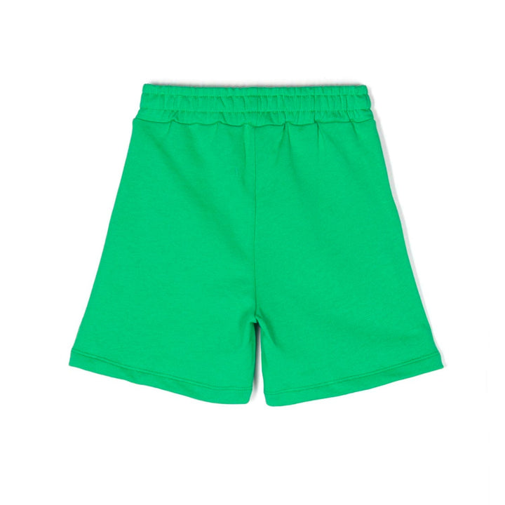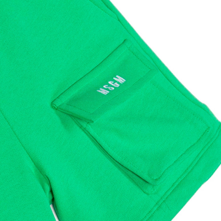 Unisex green embroidered-logo cargo shorts with two front cargo pockets and elasticated waistband.