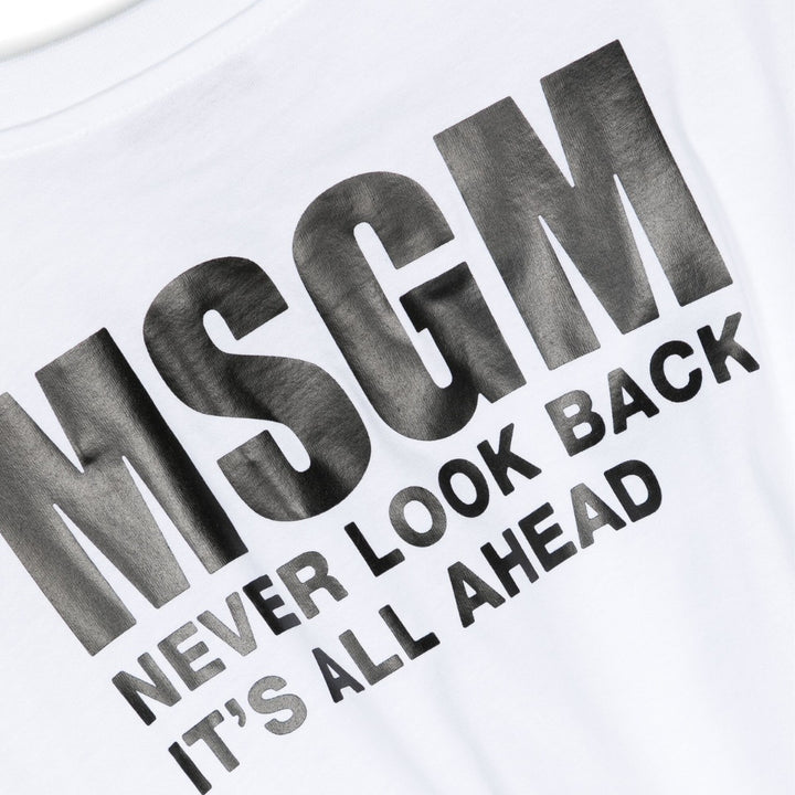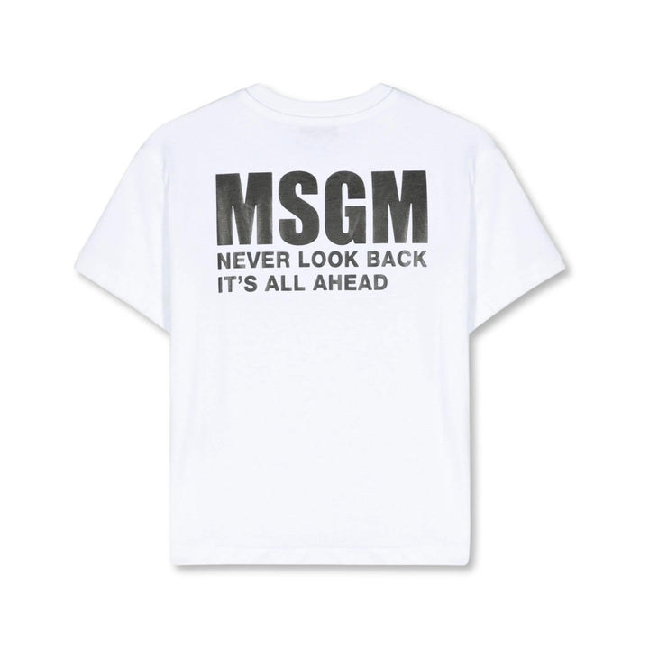 Unisex white cotton T-shirt with logo print to the back and short sleeves.