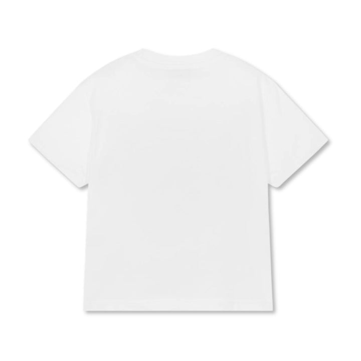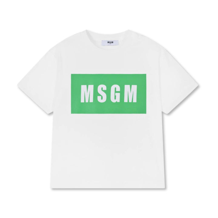 A white cotton T-shirt for boys and girls by MSGM. Made in soft jersey, this short-sleeved style has a bright green box logo design on the front for instant designer appeal.