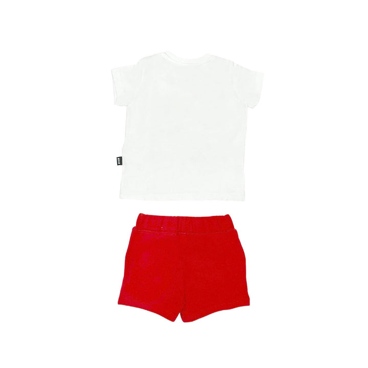 Casual cotton T-shirt and shorts set by MSGM for little boys and girls, made in comfortable jersey. The white t-shirt has a colourful logo embroidered across the chest and popper fastenings on one shoulder for speedy dressing. The black shorts have an elasticated waistband, logo embroidery and useful, concealed side pockets.