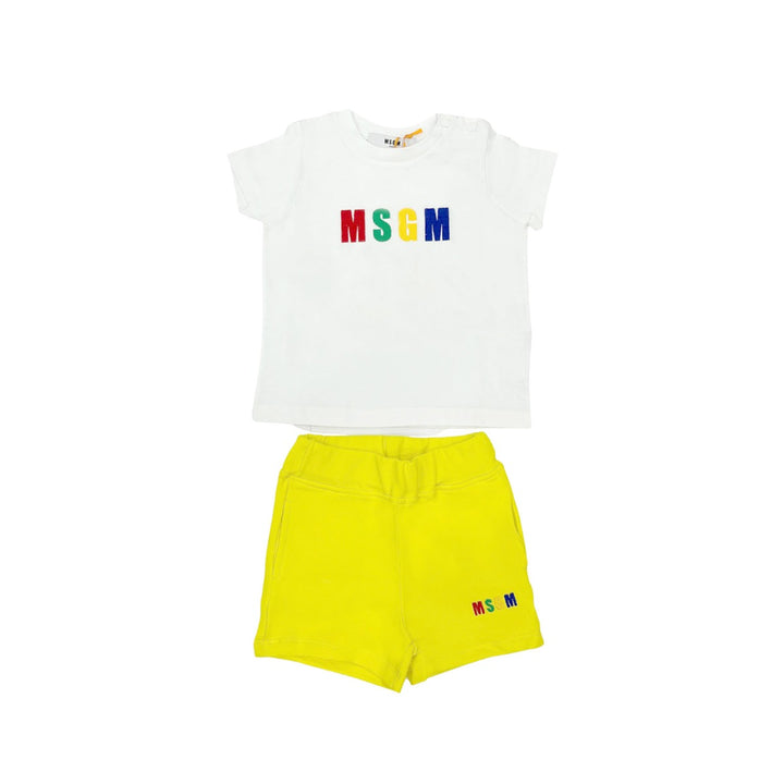Casual cotton T-shirt and shorts set by MSGM for little boys and girls, made in comfortable jersey. The white t-shirt has a colourful logo embroidered across the chest and popper fastenings on one shoulder for speedy dressing. The black shorts have an elasticated waistband, logo embroidery and useful, concealed side pockets.