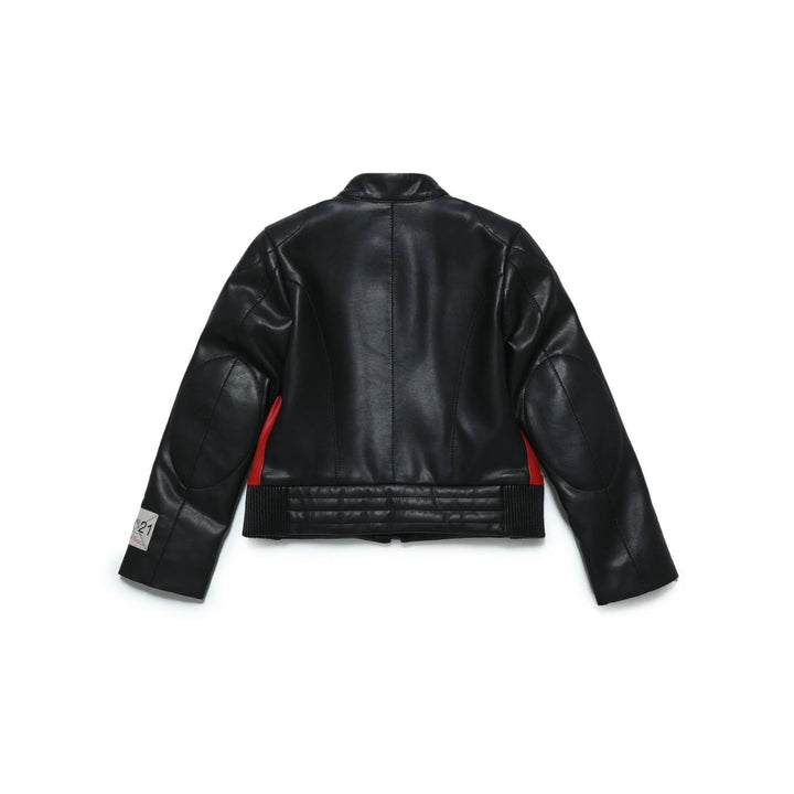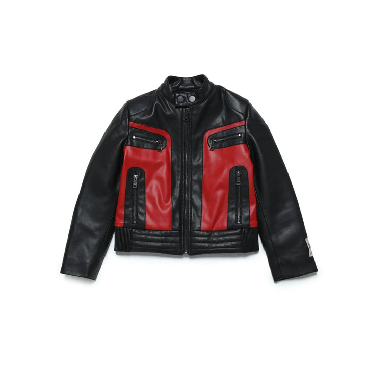 Long-sleeved, imitation leather biker jacket with colorblock details. Features a button closure on the collar, functional pockets and breast pockets, and a patch with logo on the cuff.A garment with a rock soul, where the colorblock effect enhances style and personality.