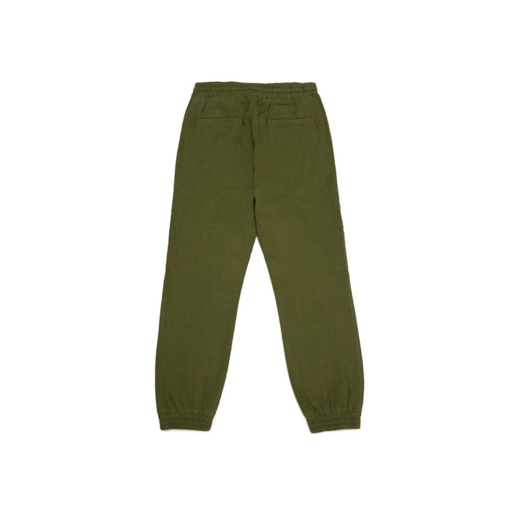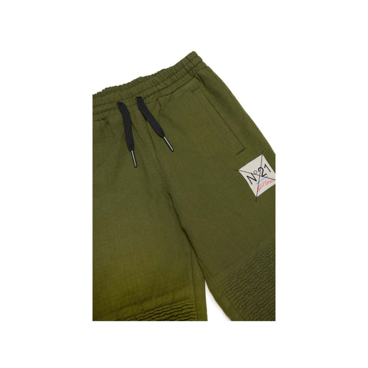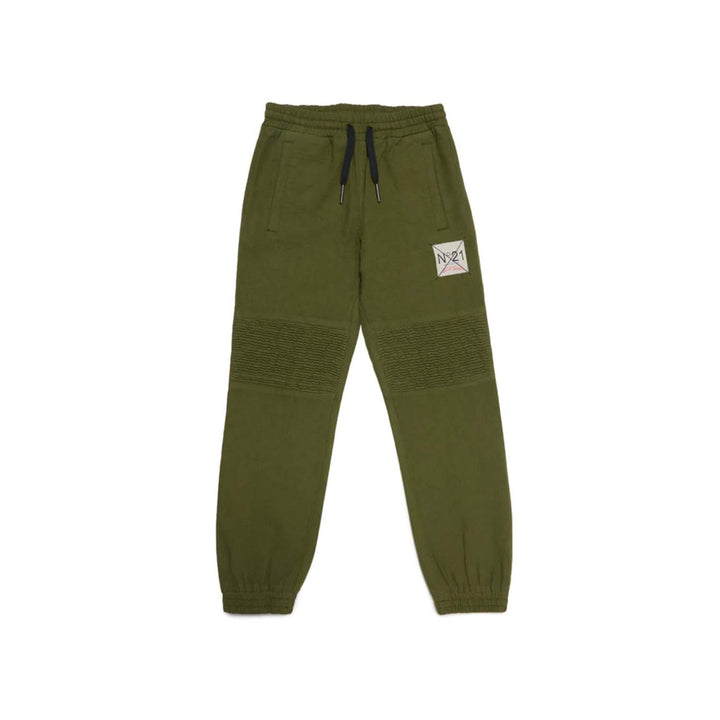Green logo-print leg trousers from N-21 Kids featuring olive green, cotton, logo print to the front, elasticated waistband, elasticated ankles, straight leg and classic five pockets.
