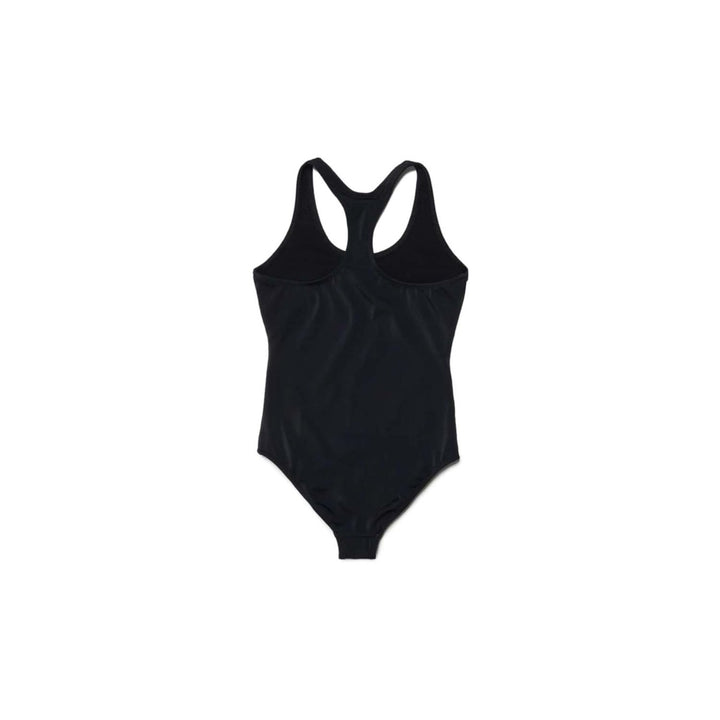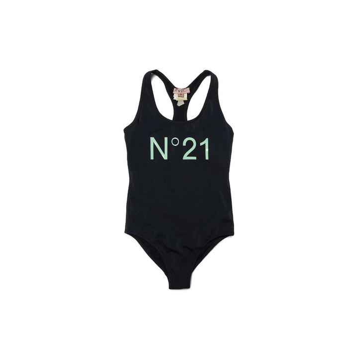 Black logo-print swimsuit from N-21 Kids featuring black, logo print to the front, racerback, round neck and sleeveless. Be mindful to try on swimwear over your own garments.