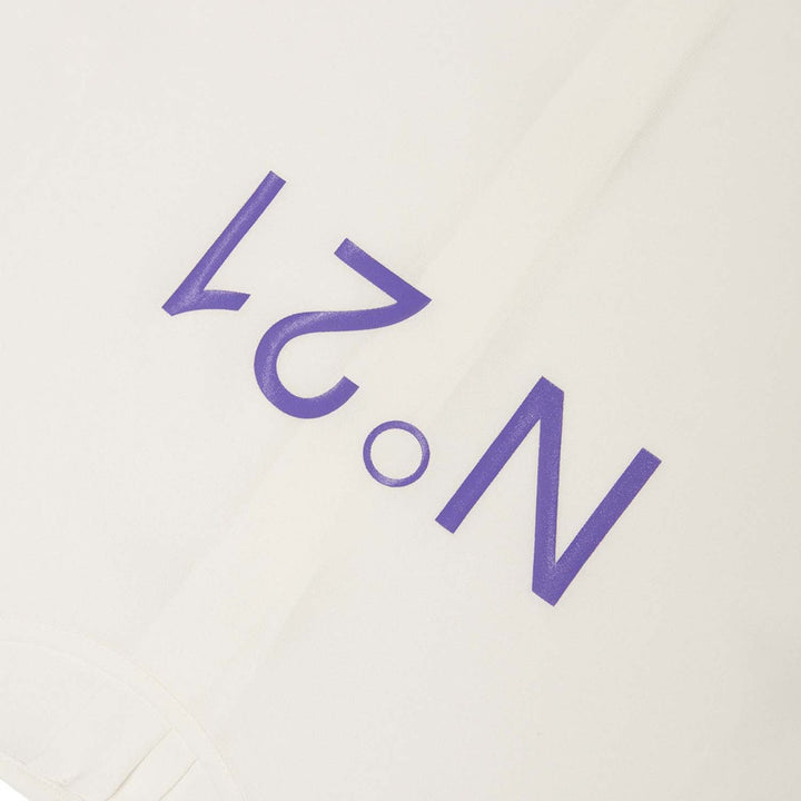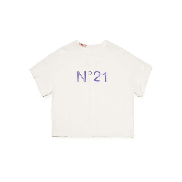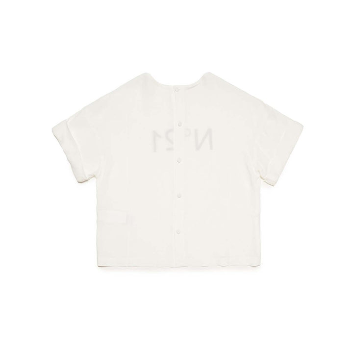 Crew-neck shirt in super fluid viscose crepe. Soft silhouette with dropped sleeves and taken up. Lined button closure at back. Featuring a tone-on-tone embroidered N°21 Institutional logo on the front. A romantic-inspired garment. Suitable for a variety of occasions.