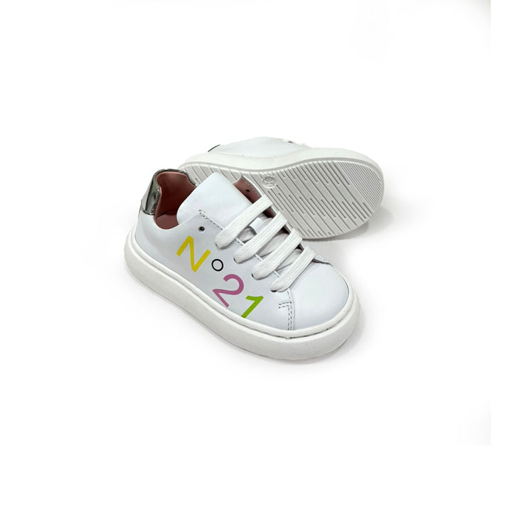 Logo-patch low-top sneakers from No21 Kids featuring white-multicolor, calf leather, logo patch to the side, round toe, front lace-up fastening, branded insole and flat rubber sole.