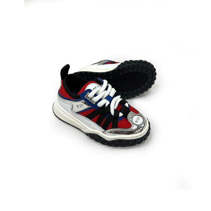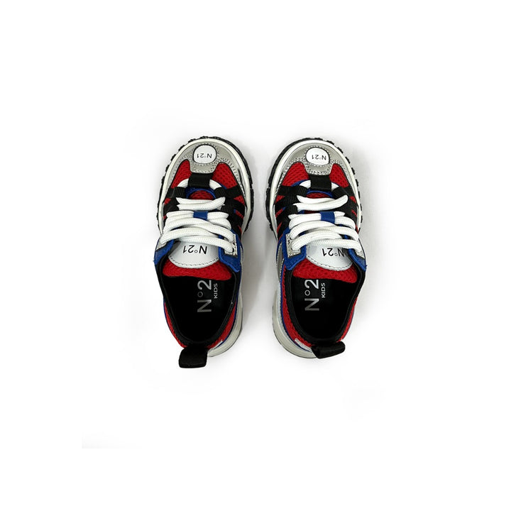 Unisex Multicolor shoes for kids by N21 with a yellow color material on top and thread designs and black zig zag stiched designs. It is latest and trendy design for your kids. It has a silver shiny patch on the front of shoes.