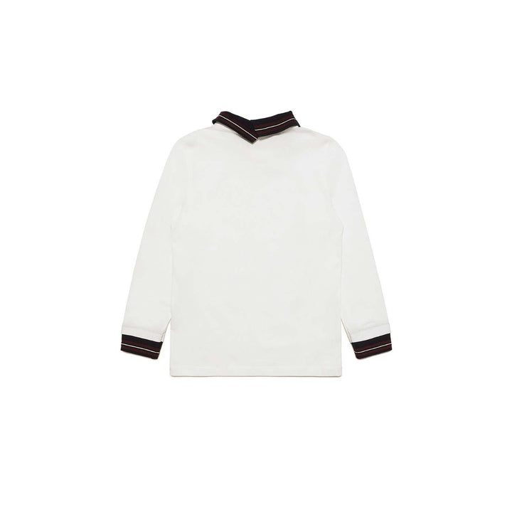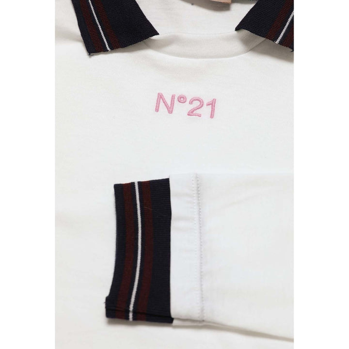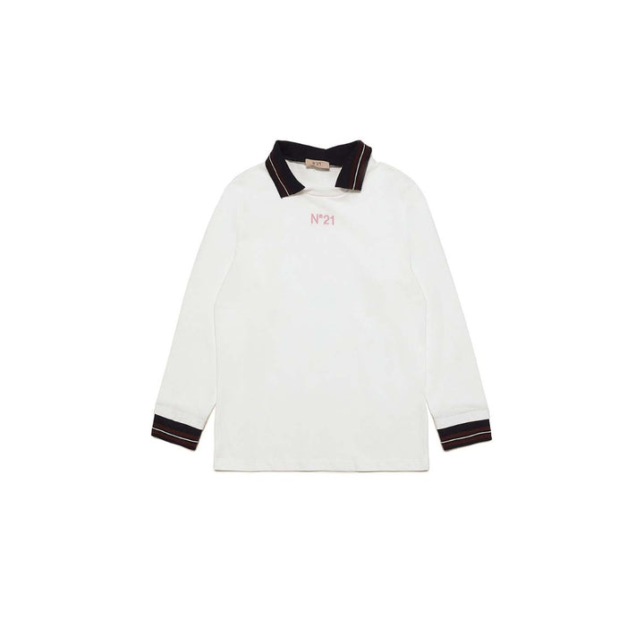 Long-sleeve white cotton jersey polo shirt with a collar, striped cuffs and the contrasting color N°21 logo embroidered on the front.