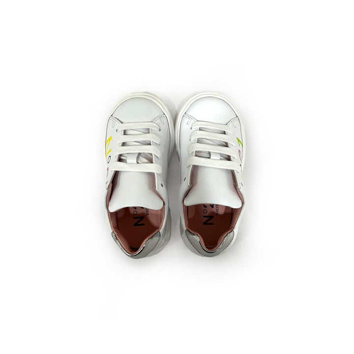 Logo-patch low-top sneakers from No21 Kids featuring white-multicolor, calf leather, logo patch to the side, round toe, front lace-up fastening, branded insole and flat rubber sole.