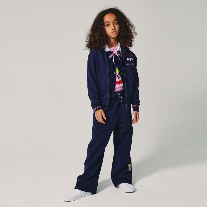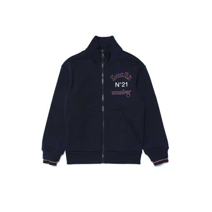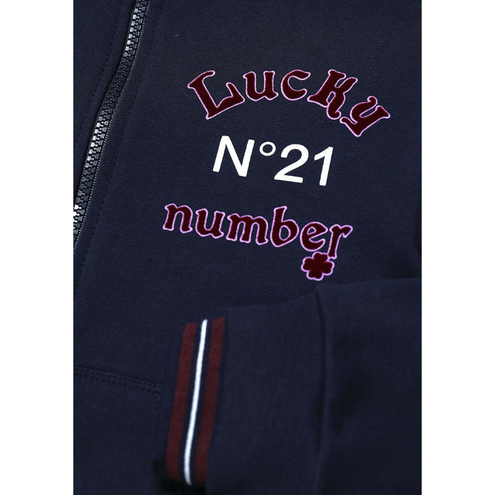 Navy blue long-sleeve cotton sweatshirt with front zip fastening, Lucky Number N°21 velvety-effect logo on the heart, and ribbed cuffs and hem.