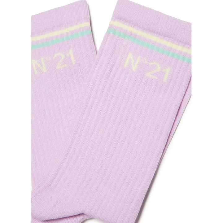 Cotton-blend socks with stripes and institutional logo above the ankle.\