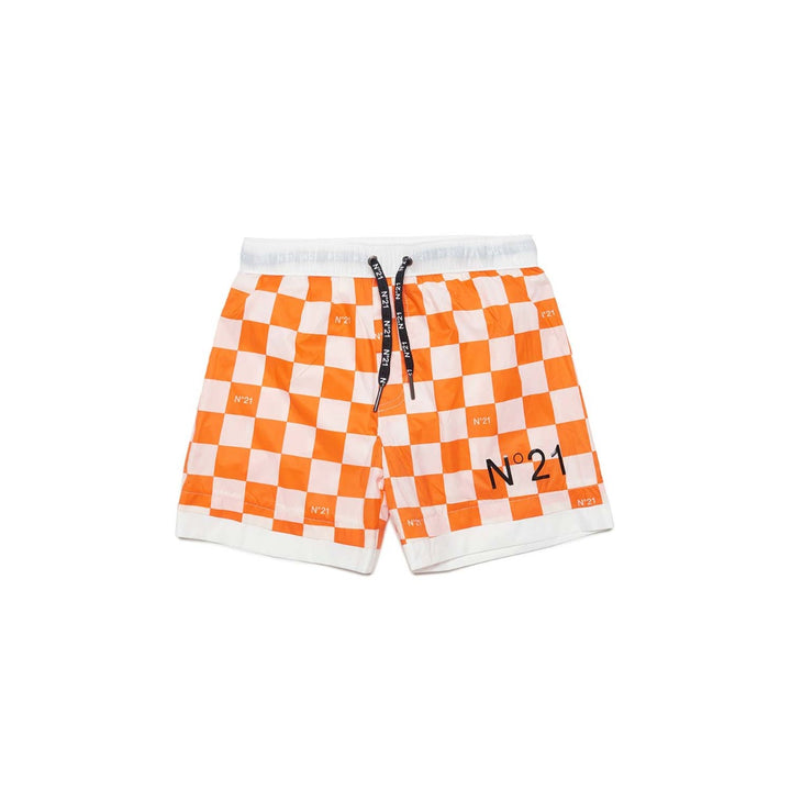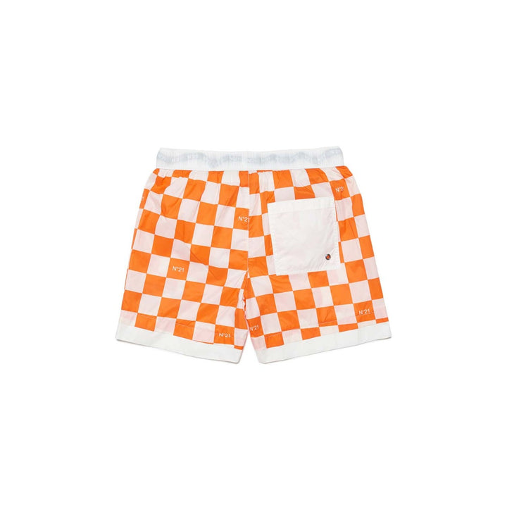 Lightweight nylon boxer swimming costume with damier graphic inspired by the Venice Beach Skatepark, contrasting colour logo, patch pocket in back.\