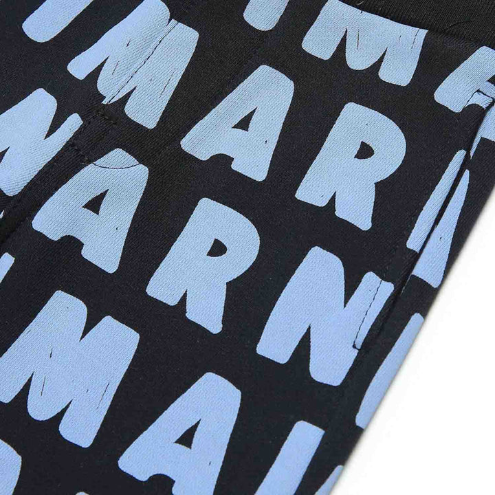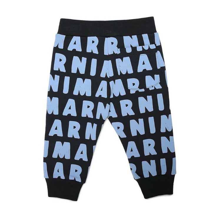 Navy blue cotton fleece joggers with contrasting color all-over logo print, elastic waist and hem, and back pocket.