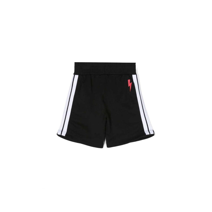 Boys Black Logo Shorts From Neil Barrett Kids With An Elastic Waistband . It Features White Strips With Black Pippin On Both Sides Of The Shorts With A Black Drawstring On Waistband For Extra Comfort And Fit.