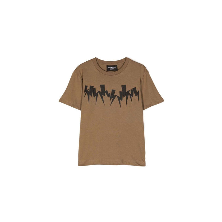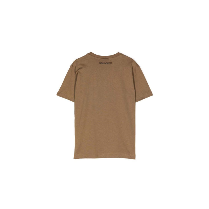 Boys Khakhi Colour Logo T-Shirt By Neil Barrett. Made From Soft Cotton, It Features A Signature Thunderbolt Print In Black On The Front And It Has A Logo Print At The Back Neck.