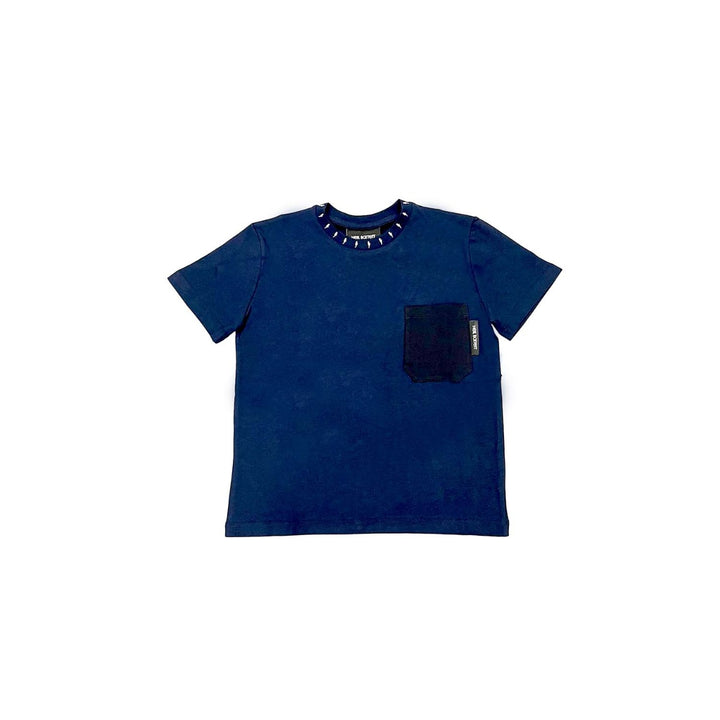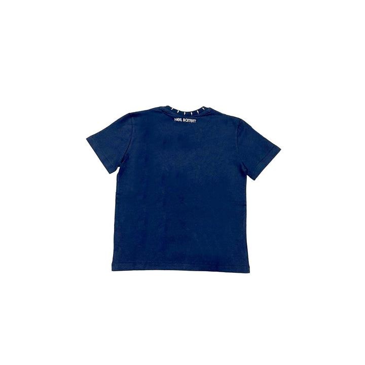 Boys Navy Blue T-Shirt By Neil Barrett. Made From Soft Cotton, It Features A Signature Thunderbolt In Black Colour On The Round Collar With A Side Pocket And It Has A Logo Print At The Back Neck.