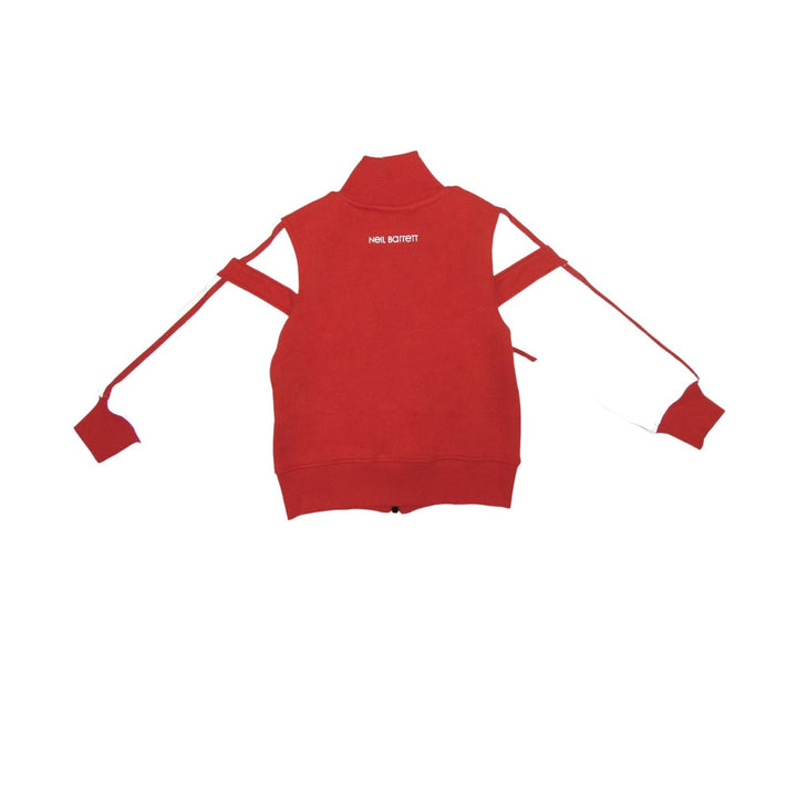 Neil Barrett kids red sweat jacket with white full sleeves and a chain in front, pocket attached in on both the sides.