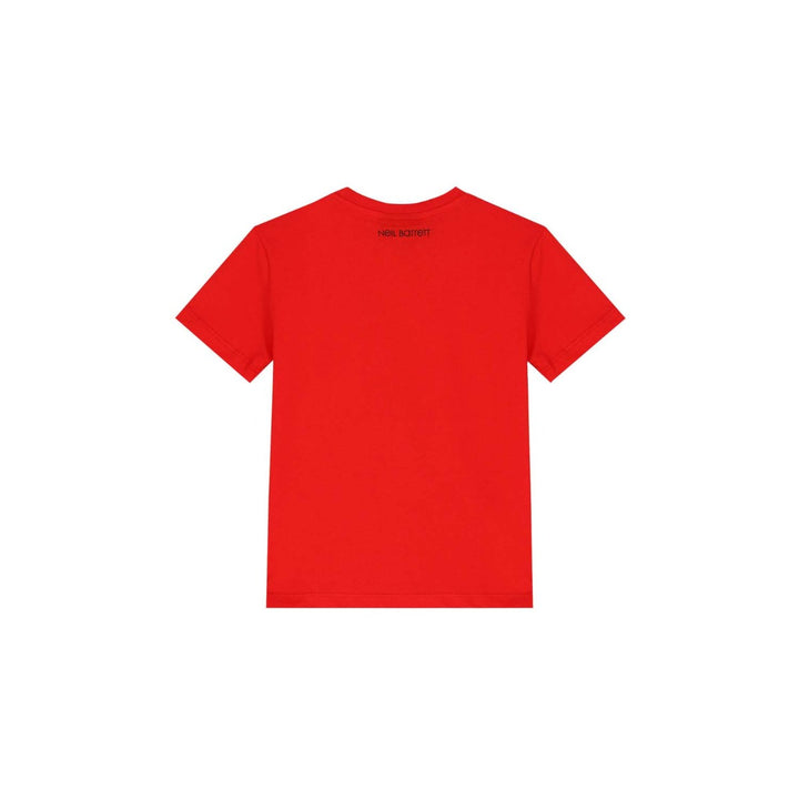 Boys Red Logo T-Shirt By Neil Barrett. Made From Soft Cotton, It Features A Signature Thunderbolt In Black And White Respectively On The Front And It Has A Logo Print At The Back Neck.