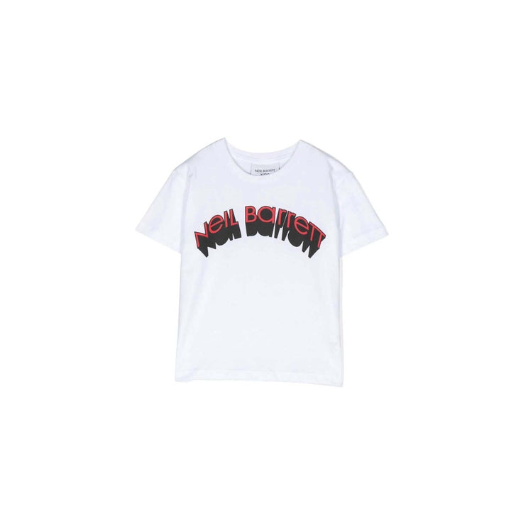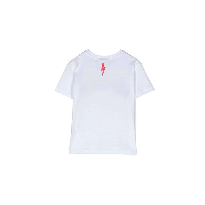 Boys White Logo T-Shirt By Neil Barrett. Made From Soft Cotton, It Features A Signature Thunderbolt And Smiley Print In Black And White Respectively On The Front And It Has A Logo Print At The Back Neck.