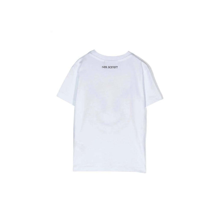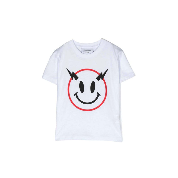 Boys White Logo T-Shirt By Neil Barrett. Made From Soft Cotton, It Features A Signature Thunderbolt And Smiley Print In Black And White Respectively On The Front And It Has A Logo Print At The Back Neck.