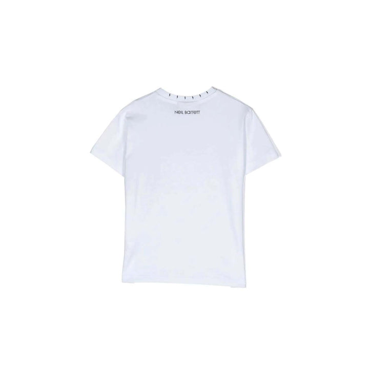 Boys White T-Shirt By Neil Barrett. Made From Soft Cotton, It Features A Signature Thunderbolt In Black Colour On The Round Collar With A Side Pocket And It Has A Logo Print At The Back Neck.