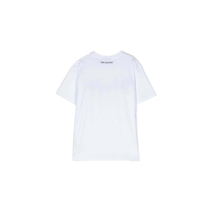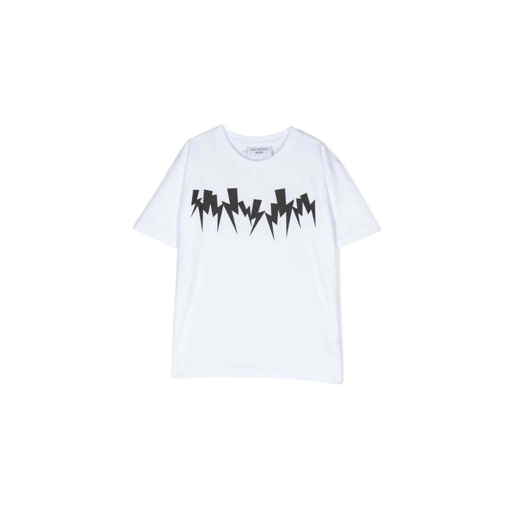 Boys White Logo T-Shirt By Neil Barrett. Made From Soft Cotton, It Features A Signature Thunderbolt Print In Black On The Front And It Has A Logo Print At The Back Neck.