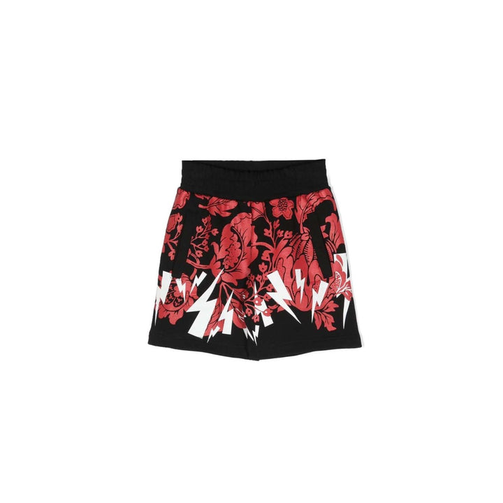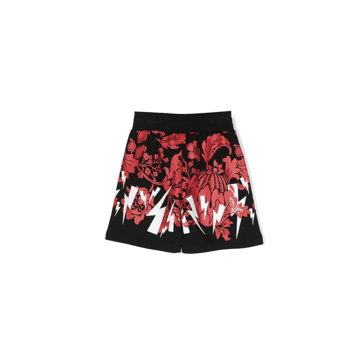 Boys Black/White/Red Cotton Shorts With All-Over Floral And Signature Thunderbolt Print, Ribbed Waistband, Two Side Slit Pockets And Thigh-Length.