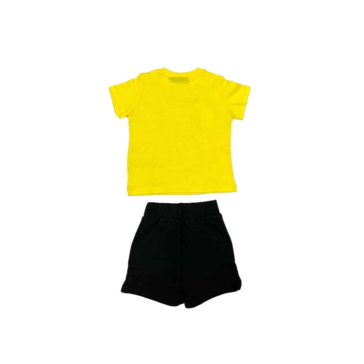 Boys Yellow T-Shirt With Signature Thunderbolt Print And Logo On The Front Of T-Shirt, Paired With A Black Bottom Shorts. Fun And Easy Outfit For Your Kids.