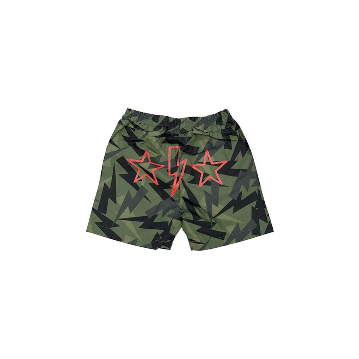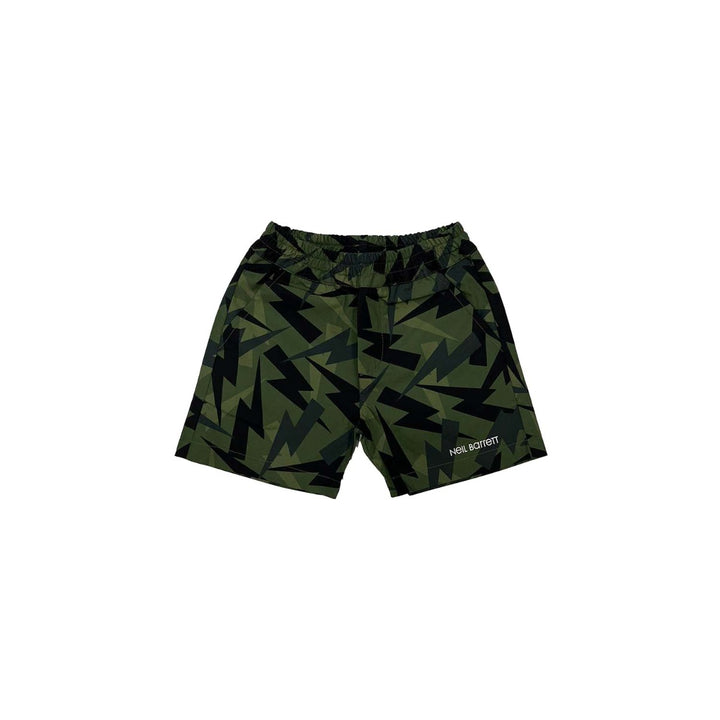 Neil Barrett Kids Swim Shorts Made Of Military Green Fabric With An All-Over Thunderbolt Motif Printed In A Contrasting Colour And A Small White Neil Barrett Logo On The Front Bottom