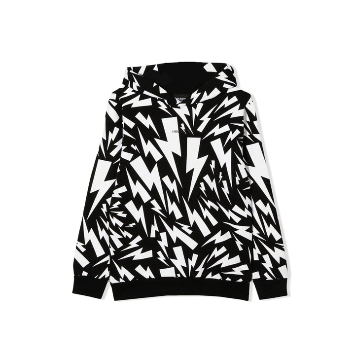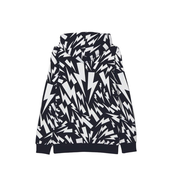 Neil Barrett Kids black hooded sweat shirt with full black sleeve and a logo name written on centre with white lightening prints all over the sweatshirt.