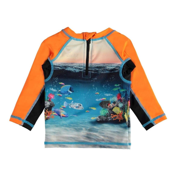 Nemo is a long sleeve UV rash guard for small children that protects against the sun's harmful rays since Molo's swimwear has a UV protection of 5+. This Nemo rash guard has a colourful print of coral and fish underneath the surface of the ocean. The