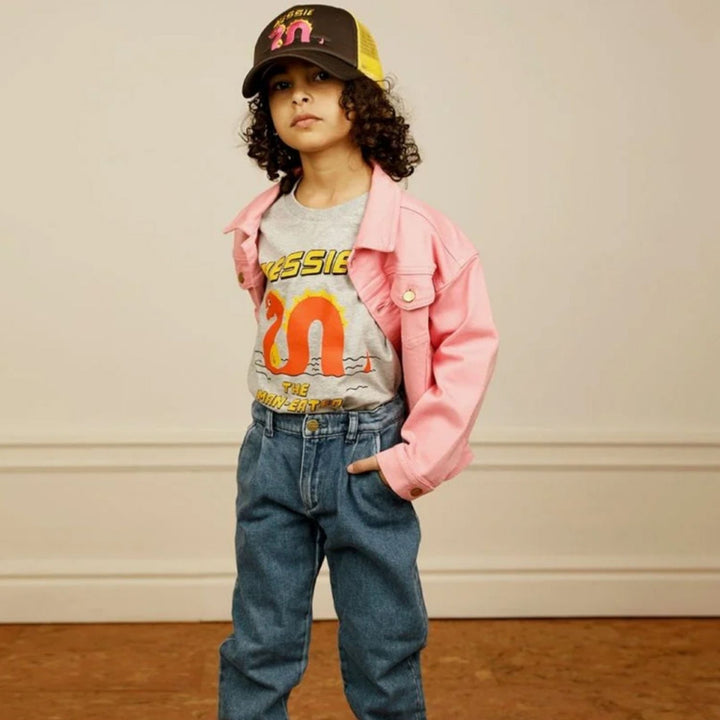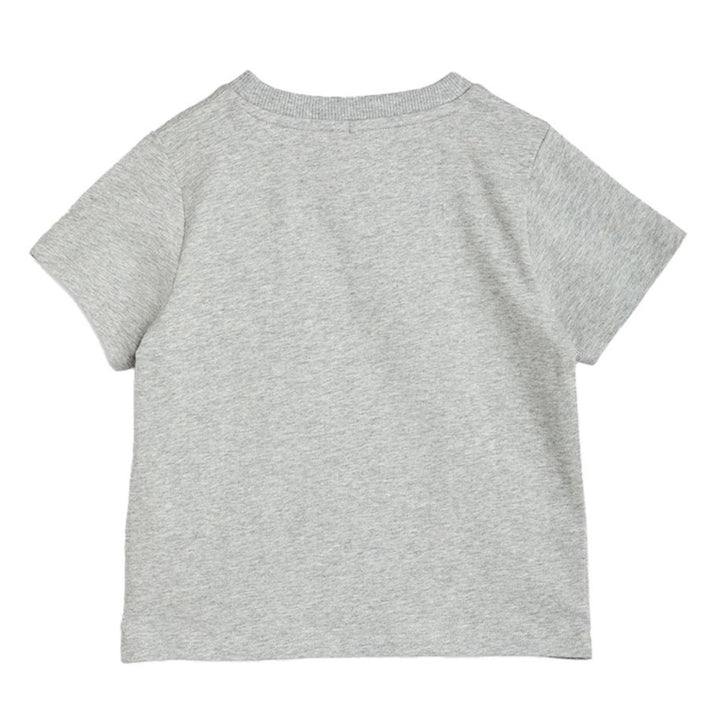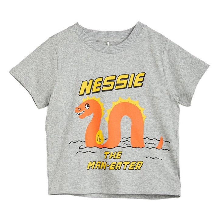 Grey melange T-shirt with a Nessie print made from GOTS certified organic cotton with a hint of stretch. The T-shirt has a ribbed neck and is designed for a regular fit. The smallest sizes (56/62–68/74) have snap buttons at the shoulder for easy dr