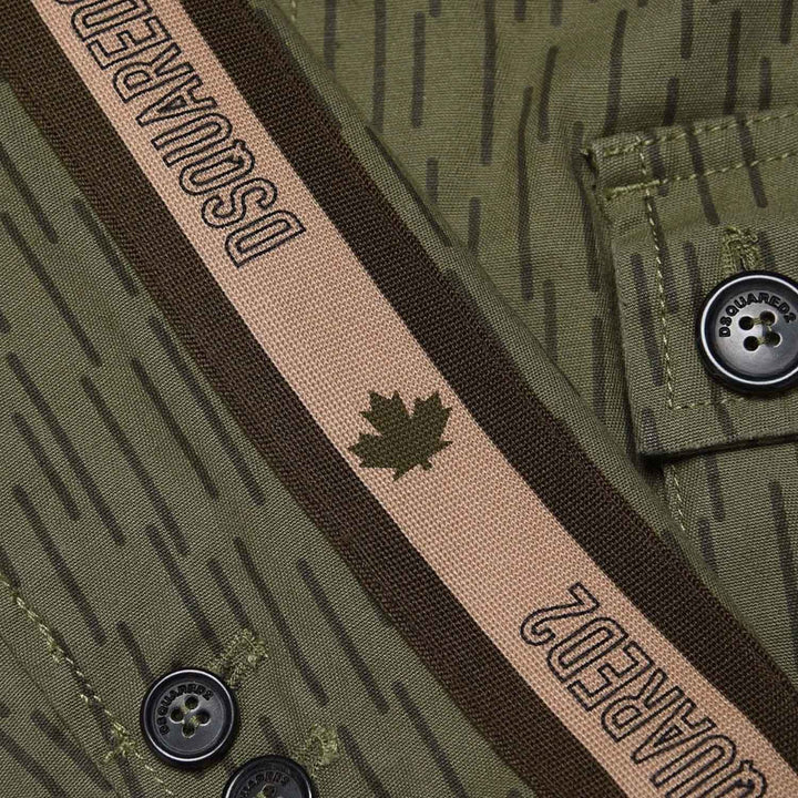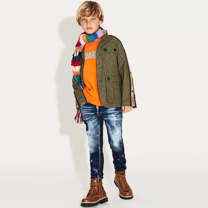 Olive green boys coat by dsquared2 with a nice patterened sleeve and logo name written on side. A cute detailing in the front with pockets and buttons.