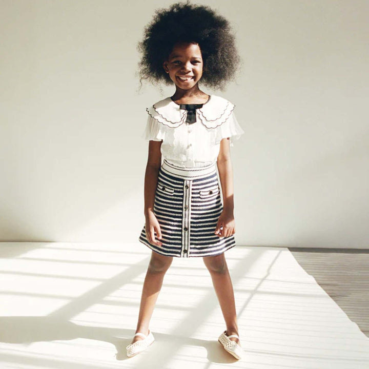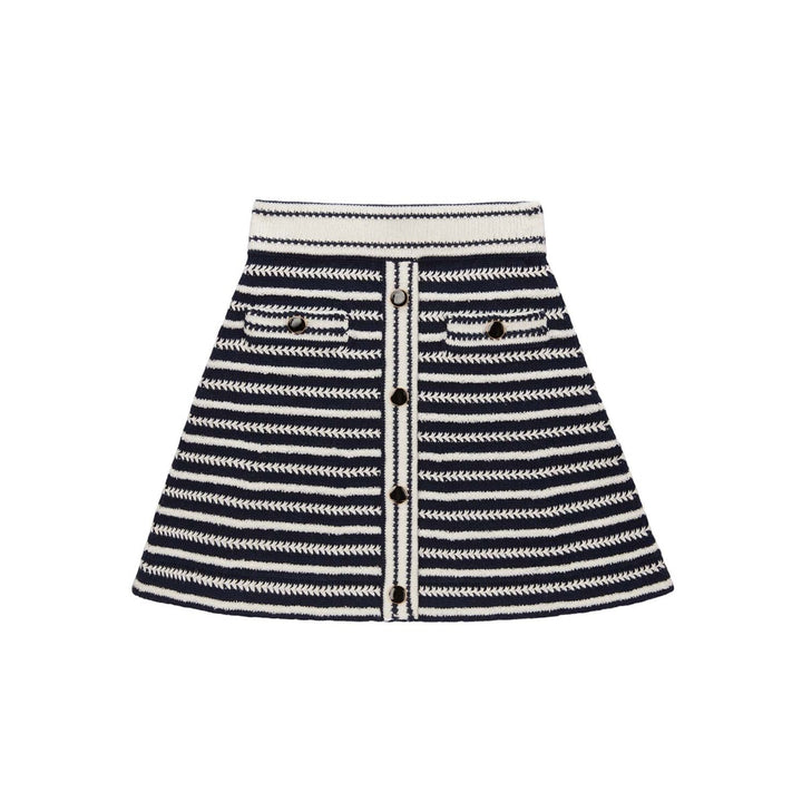 Classic stripes add a Parisian charm to this skirt, which is cut from cotton wool knit and has an elasticated waistband for stretch and ease of movement. Style it with a white button-up blouse and our matching cardigan for her next outing.